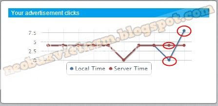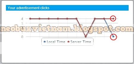 -Đường màu xanh là Local Time. Đường màu đỏ là Server Time. Bạn nhìn vào biểu đồ và hiểu là, theo Server Time NBVN click được 4 ads, nhưng theo Local Time NBVN không click được ads nào.